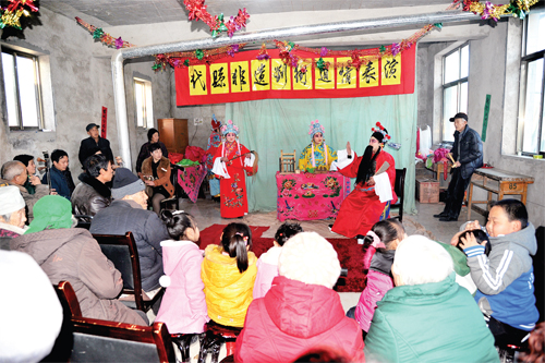 為了搶救劉街道情“非遺”劇種,弘揚(yáng)和傳承雁門文化,新高鄉(xiāng)劉街村“ 兩委”班子多方籌措資金,購買服裝道具和文武場樂器,于近期成立了由30多人組成的劉街道情劇團(tuán),由老藝人傳授技藝。他們經(jīng)過3個多月的精心排練,已排練出《李大開店》、《夜宿花亭》、《雷橫磕枷》、《大上吊》、《劈棺》、《?;稹返?個劇目,將于元宵節(jié)期間亮相于縣城街頭,向全縣人民匯報演出。圖為熱心觀眾觀看劉街道情《李大開店》劇目的排練。(石俊文 劉睿 攝)