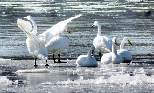 三月里的一天,黃河河曲段殘留的冰塊盡皆融化,天鵝迎春歸來。(石繁榮 攝)
