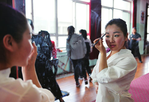 如今的太雨琴是一名北路梆子劇團(tuán)的演員,隨著走向社會(huì),她越發(fā)感覺到肩頭的重任。傳統(tǒng)戲劇,尤其是北路梆子這樣的地方少數(shù)劇種,那種萬人爭(zhēng)睹的景象已經(jīng)一去不復(fù)返了?,F(xiàn)在除了一些縣鄉(xiāng)的節(jié)日慶典,很少有人愿意花錢到劇場(chǎng)觀看。這樣一來,北路梆子也就面臨著演出市場(chǎng)萎縮、大量演員流失的狀況。與其說太雨琴在靠戲曲吃飯,不如說她在用信念堅(jiān)持。(何光暉 攝影報(bào)道)