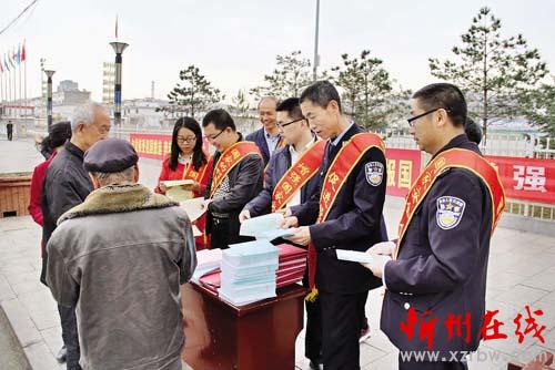 4月15日是全民國家安全教育日,神池縣開展多種形式的宣傳教育活動,在各種公共場所設(shè)立宣傳專欄,在縣人民廣場進(jìn)行安全法宣傳教育。圖為當(dāng)天上午,縣國家安全領(lǐng)導(dǎo)小組辦公室工作人員走上街頭向過往市民散發(fā)國家安全法宣傳資料。 (楊晉明 詹俊杰 攝)