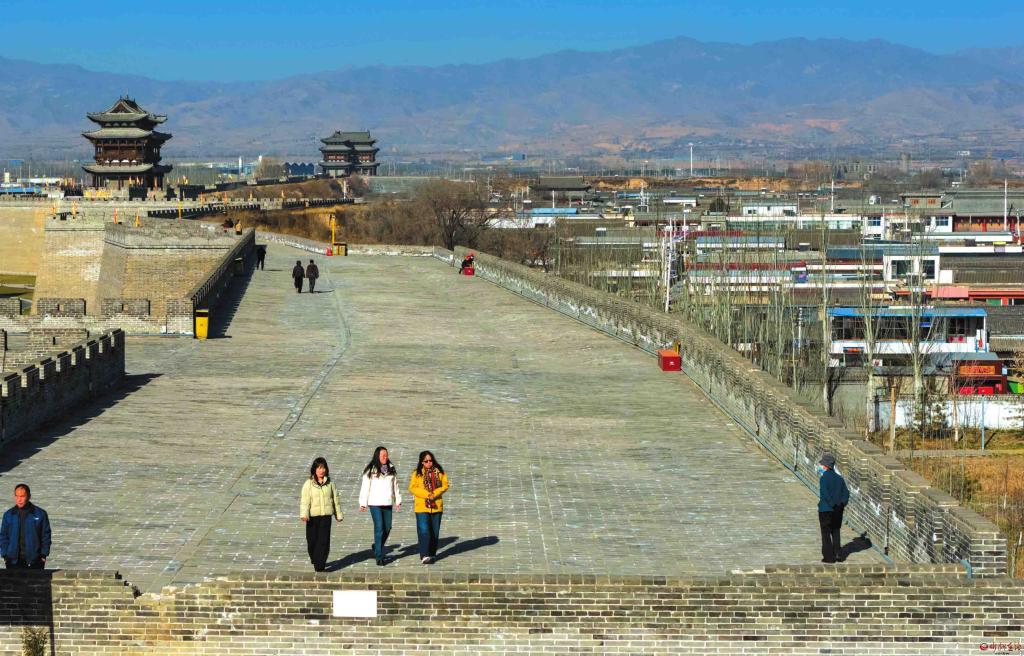 代州古城西城墻歷經多年保護性修繕,是古城目前唯一修復完整并對外開放的城墻段落。圖為12月1日,游人登上西城墻游覽觀光。(