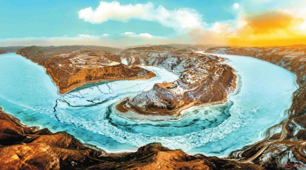 隆冬時節(jié),偏關(guān)老牛灣被冰雪覆蓋,清晨的霞光讓黃土溝壑與冰面紋理交織出別樣風(fēng)景。(