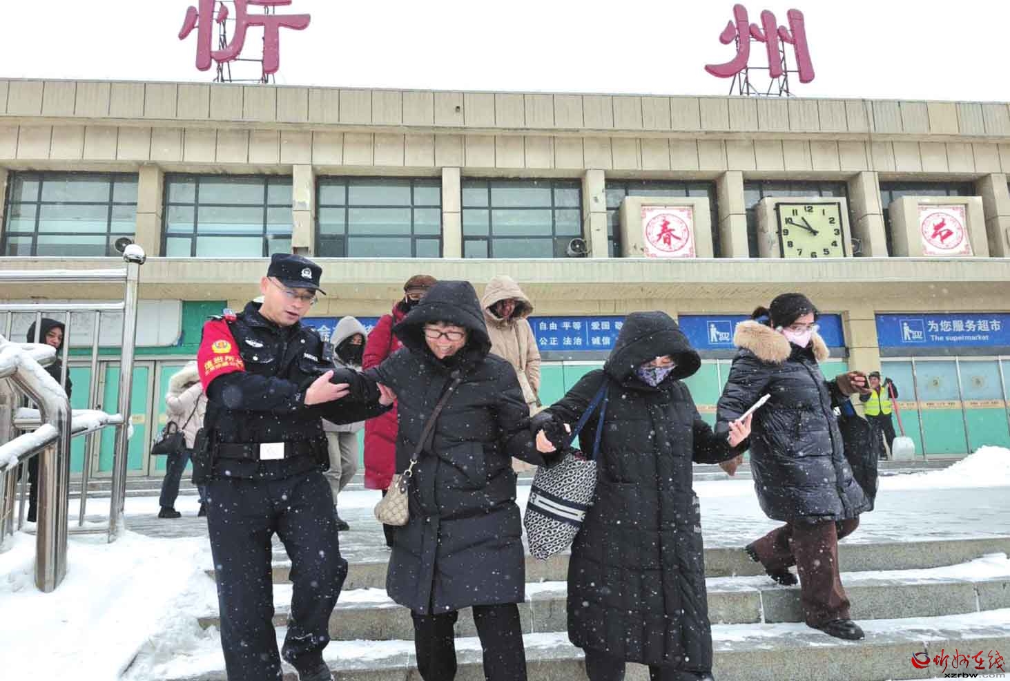 2月9日,忻州突降大雪,忻州站派出所干部民警全員堅(jiān)守崗位,在站前廣場(chǎng)、進(jìn)站口等重點(diǎn)區(qū)域巡邏防控值守執(zhí)勤。民警主動(dòng)攙扶旅客、提醒注意防滑,及時(shí)幫扶行李較多的乘客,排查整治安全隱患,用實(shí)際行動(dòng)踐行“人民公安為人民”的承諾,確保春運(yùn)期間旅客出行平安。(于新梅攝)
