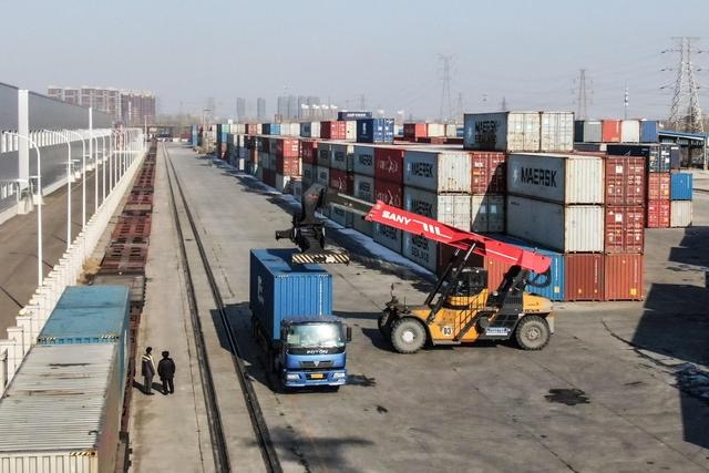 工作人員在沈陽(yáng)東站東貨場(chǎng)向中歐班列上裝運(yùn)集裝箱。新華社記者 潘昱龍 攝