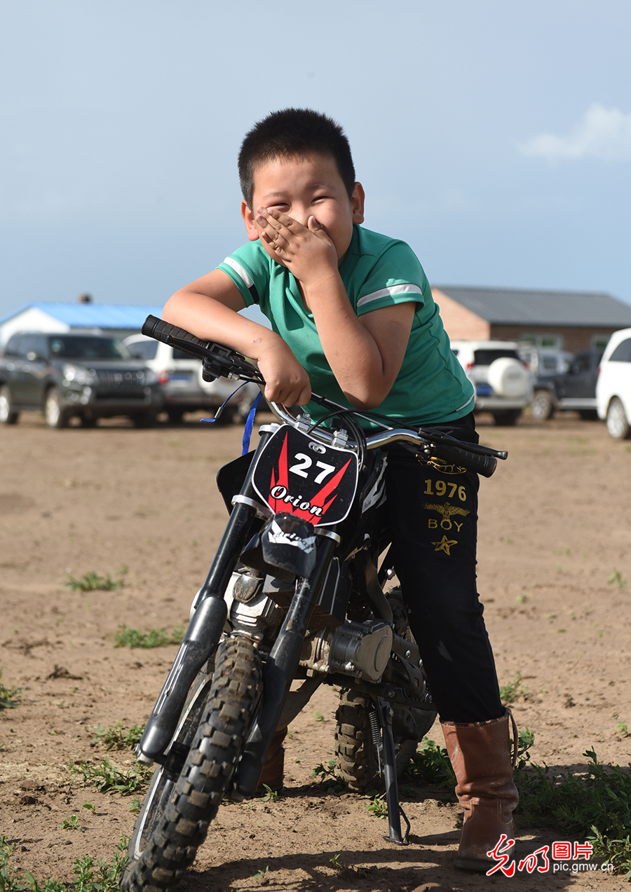 其日麥拉圖的大孫子時(shí)常會(huì)來爺爺家。對(duì)他而言,胯下的兒童玩具車就是他的“駿馬”,爺爺家的牧場就是他的后花園。圖為2020年8月2日,其日麥拉圖的孫子在牧場玩耍。(潘迪攝/光明圖片)