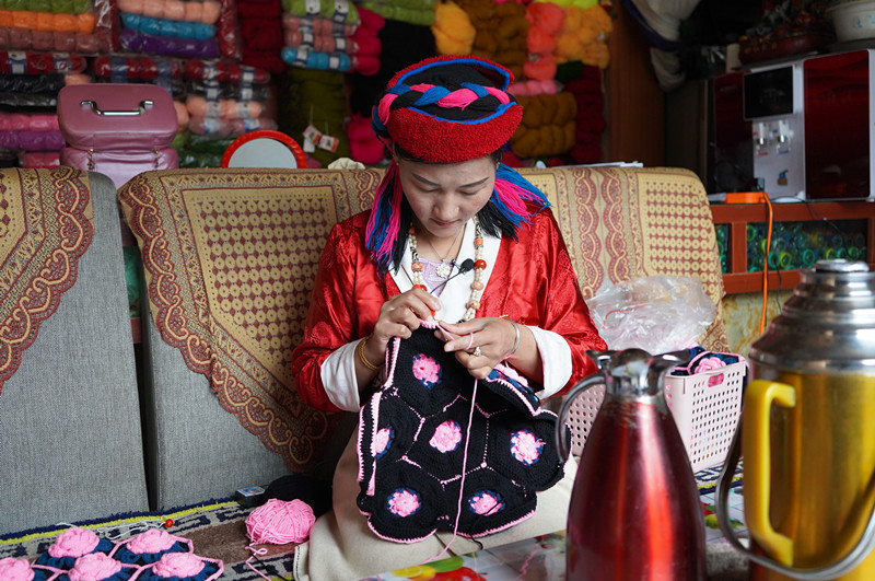 卓瑪正在家里用毛線編織著一對(duì)玫瑰花花色的抱枕套,這一對(duì)能賣(mài)400元。