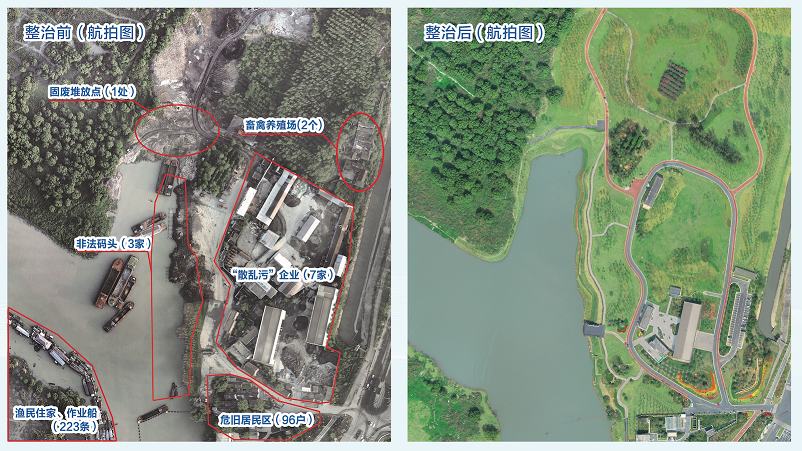 薛家洼生態(tài)園地處長江東岸,占地986畝,曾經(jīng)生態(tài)環(huán)境問題非常突出,原有非法碼頭3家,散亂污企業(yè)7家,固廢堆場1處,規(guī)?;笄蒺B(yǎng)殖場2個,危舊民居96戶,停靠漁民作業(yè)船、住家船223條?!扒缣煲簧砘遥晏煲簧砟唷?,這是曾經(jīng)薛家洼的真實寫照。
