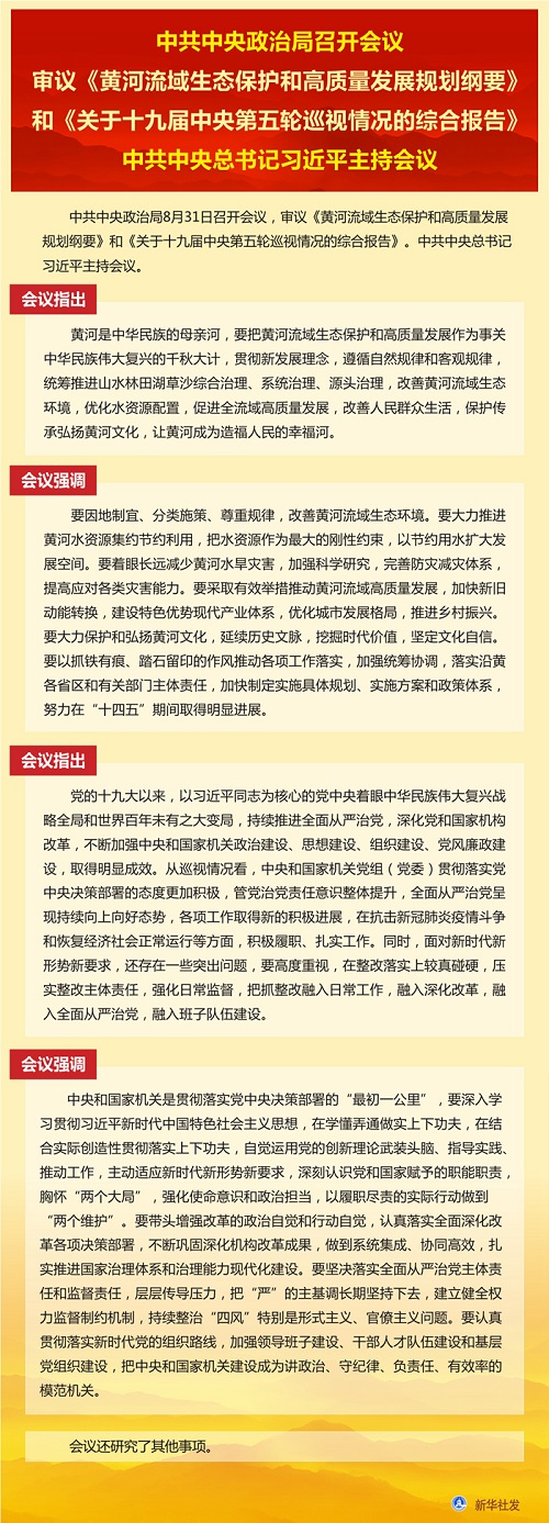 新華社北京8月31日電 中共中央政治局8月31日召開會議,審議《黃河流域生態(tài)保護和高質量發(fā)展規(guī)劃綱要》和《關于十九屆中央第五輪巡視情況的綜合報告》。中共中央總書記習近平主持會議。