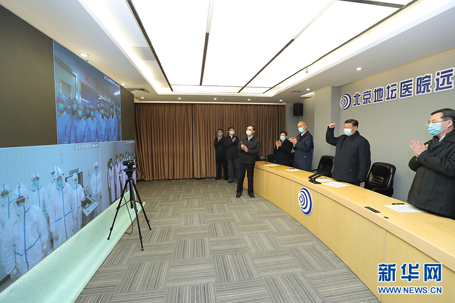 2月10日,習近平在北京調研指導新冠肺炎疫情防控工作。這是習近平在首都醫(yī)科大學附屬北京地壇醫(yī)院遠程診療中心,通過視頻連線武漢市收治新冠肺炎患者的金銀潭醫(yī)院、協(xié)和醫(yī)院、火神山醫(yī)院,了解情況、聽取意見和建議,慰問一線醫(yī)務工作者。 新華社記者 鞠鵬 攝