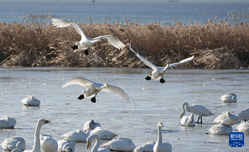 1月5日,大天鵝在榮成大天鵝國(guó)家級(jí)自然保護(hù)區(qū)棲息。(新華社記者 徐速繪 攝)