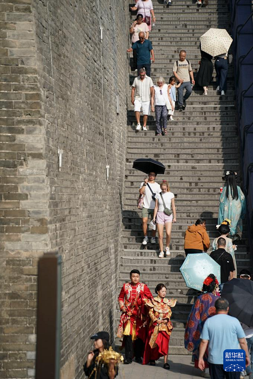 游客在西安城墻永寧門內游覽,左側城墻上布設著城墻病害數(shù)據(jù)傳感監(jiān)測設備(2025年9月12日攝)。(新華社記者 邵瑞 攝)