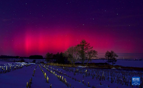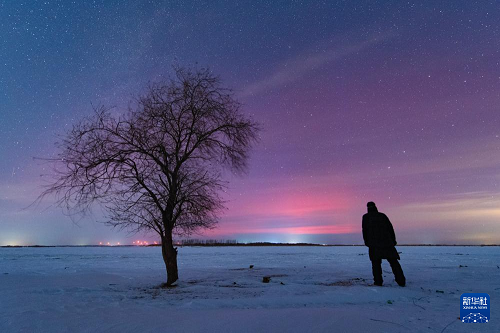 1月20日在位于黑龍江省黑河市的北大荒集團(tuán)北安分公司二龍山農(nóng)場(chǎng)有限公司拍攝的絢麗極光。(新華社發(fā) 錢泊羽 攝)