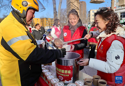 1月25日,河北省秦皇島市海港區(qū)海濱路街道開灤路社區(qū)開展“飄香臘八粥 溫馨暖人心”活動(dòng)。這是志愿者為網(wǎng)約配送員盛臘八粥。(新華社發(fā) 曹建雄 攝)