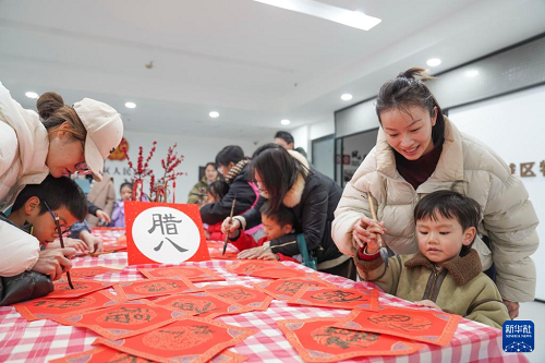 1月25日,在浙江省溫州市鹿城區(qū)大南街道雙蓮橋社區(qū),孩子與家長(zhǎng)參加臘八節(jié)傳統(tǒng)文化主題活動(dòng)。(新華社發(fā) 蘇巧將 攝)