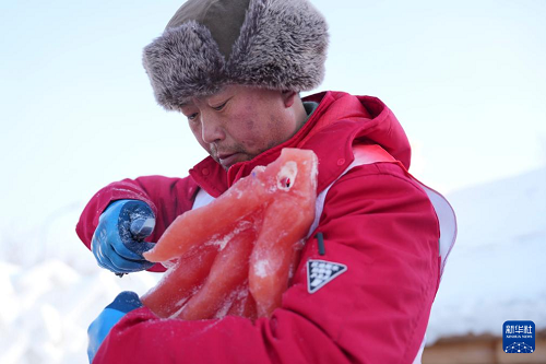 1月28日,冰雕師在第二十七屆哈爾濱冰雪大世界園區(qū)展示植物彩色冰雕。(新華社記者 王松 攝)