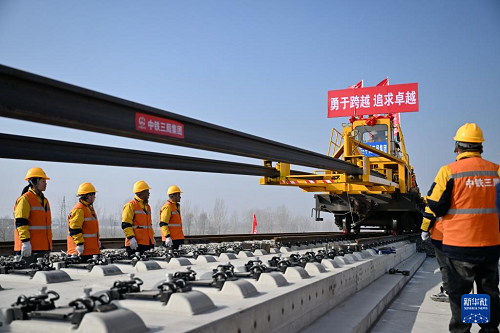 2月1日上午,在河北省保定市順平縣的雄忻高鐵建設(shè)現(xiàn)場,中鐵三局集團施工人員將首對500米長鋼軌平穩(wěn)、精準(zhǔn)地鋪設(shè)在無砟道床上,標(biāo)志著雄忻高鐵正式進入鋪軌施工階段。