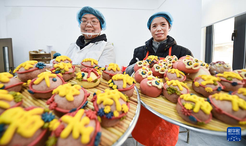 2月4日,在河南省洛陽(yáng)市西工區(qū)紅山街道棗園社區(qū)花饃工坊內(nèi),工人展示制作好的花饃。(新華社發(fā) 黃政偉 攝)