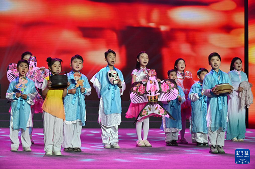 2月8日,在河南省沁陽市朱載堉音樂廳,小朋友們?cè)凇吧賰捍和怼鄙媳硌菁w詩朗誦《非遺里的中國(guó)》。(新華社發(fā) 楊帆 攝)