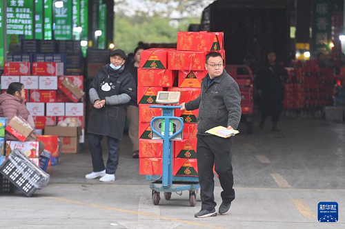 2月11日,在柳州市柳南區(qū)瑞龍路一家農(nóng)產(chǎn)品批發(fā)市場,商家在搬運水果。(新華社記者 黃孝邦 攝)