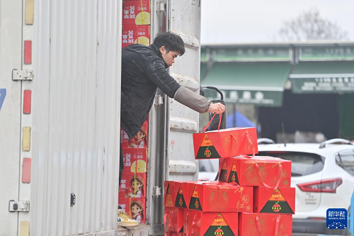 2月11日,在柳州市柳南區(qū)瑞龍路一家農(nóng)產(chǎn)品批發(fā)市場,市民將年貨搬上車。(新華社記者 黃孝邦 攝)