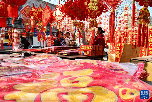 2月12日,市民在河北省邢臺市南和區(qū)和陽鎮(zhèn)年貨集市選購節(jié)慶飾品。(新華社記者 朱旭東 攝)