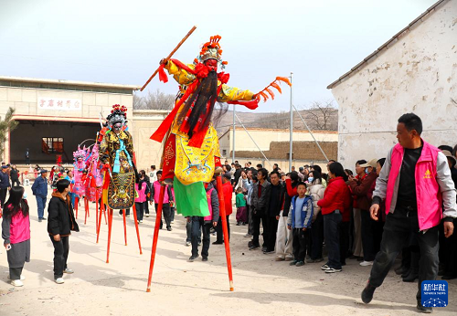 2月23日,社火隊員在甘肅省平涼市靜寧縣李店鎮(zhèn)李店村表演踩高蹺。(新華社發(fā) 王毅 攝)