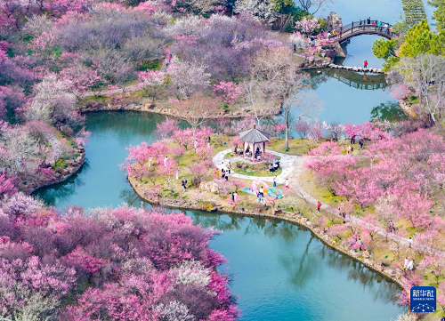 2月25日,游客在江蘇揚州瘦西湖風(fēng)景區(qū)賞梅游玩(無人機照片)。(新華社發(fā) 周社根 攝)