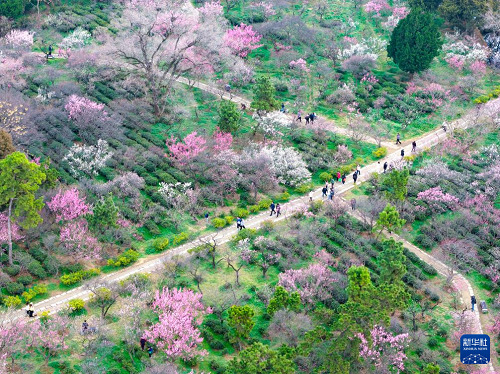 2月25日,游客在江蘇南京明孝陵梅花山上賞梅踏春(無人機照片)。(新華社發(fā) 楊素平 攝)