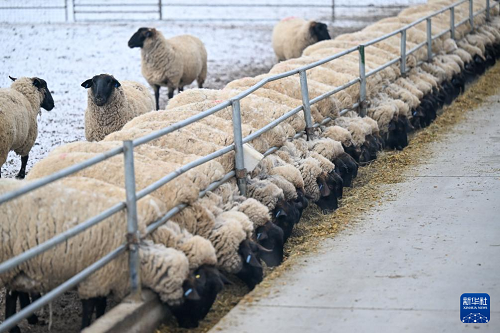 這是在位于新疆昌吉回族自治州的日發(fā)新西域瑪納斯牧業(yè)有限公司拍攝的薩福克羊(3月3日攝)。(新華社記者 丁磊 攝)