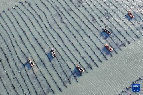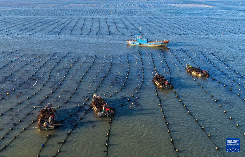 3月9日,在山東省榮成市愛倫灣海洋牧場海帶養(yǎng)殖區(qū),養(yǎng)殖工人收獲海帶(無人機(jī)照片)。(新華社發(fā) 李信君 攝)