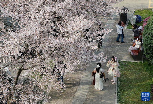 3月24日,游人在西安市雁塔區(qū)曲江池西路的櫻花樹下拍照、游玩(無人機照片)。(新華社記者 邵瑞 攝)