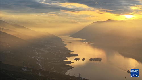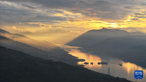 傍晚時分,落日余暉下的長江重慶奉節(jié)段秀美如畫,別有一番風(fēng)味(3月24日攝,無人機(jī)照片)。(新華社記者 王全超 攝)