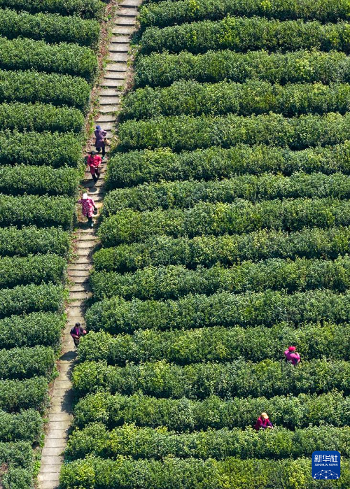 3月29日,在廣西賀州市平桂區(qū)鵝塘鎮(zhèn)盤谷村,茶農(nóng)在采摘明前茶。(新華社發(fā) 黃旭胡 攝)