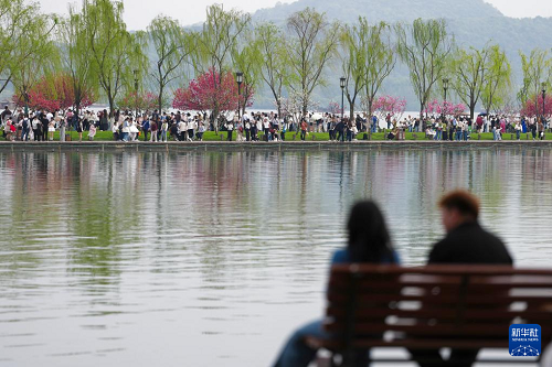 4月2日,游客在杭州西湖景區(qū)的白堤上游覽。(新華社記者 黃宗治 攝)