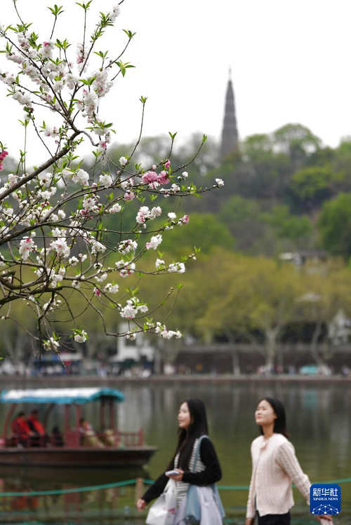4月2日,游客在杭州西湖景區(qū)的白堤上游覽?!伴g株楊柳間株桃”是西湖白堤特有的景觀。(新華社記者 黃宗治 攝)