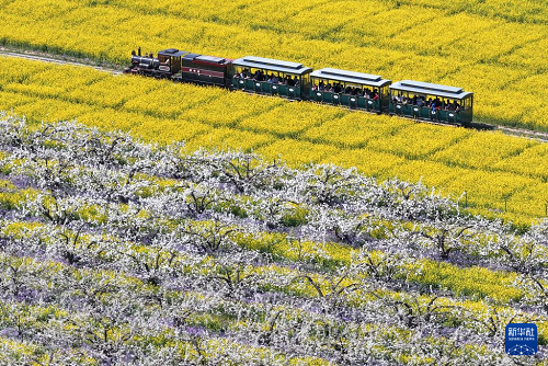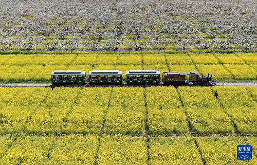 4月6日,游客乘觀光小火車從河北省晉州市周家莊鄉(xiāng)第九生產(chǎn)隊(duì)梨園旁經(jīng)過(guò)(無(wú)人機(jī)照片)。(新華社記者 楊世堯 攝)