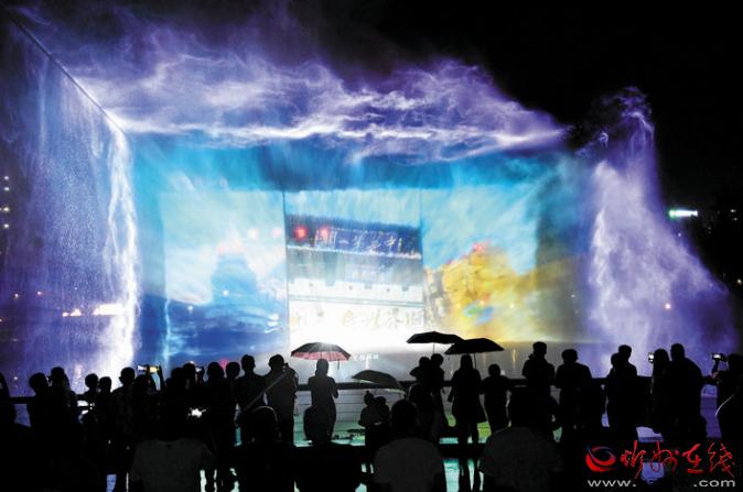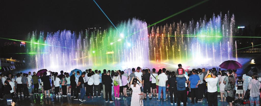 公園在注重園林、景觀建設(shè)的同時(shí),突出主題文化內(nèi)涵的展現(xiàn),湖水噴泉、觀賞果園、主題植物園、階梯花臺(tái)等特色園林具有觀賞性,園內(nèi)還配套建有遺山文化館、張拉膜廣場(chǎng)、健舞劇場(chǎng)、休閑茶吧、咖啡館等群眾休閑活動(dòng)場(chǎng)所,是又一惠及民生的心靈家園。圖為8月1日晚,市民在遺山公園噴泉廣場(chǎng)觀賞絢麗多彩的噴泉燈光秀。劉紀(jì)森 智芝龍 白曉明 胡 煒 攝