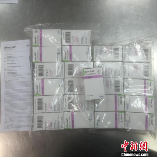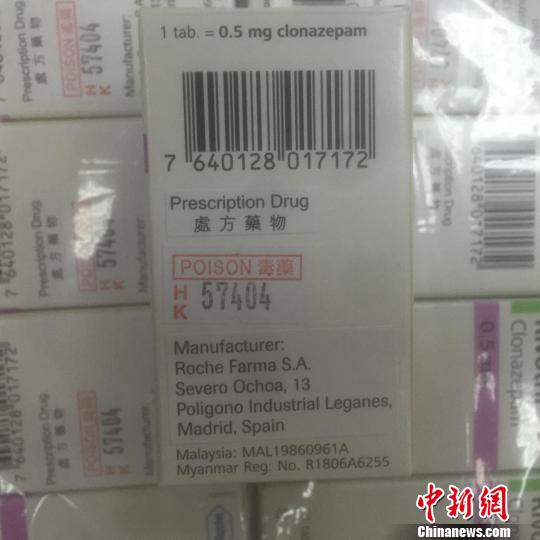 經(jīng)查驗(yàn)發(fā)現(xiàn),背包內(nèi)放置著23盒嶄新的藥物,共計(jì)1.4千克。這些藥物分四排用透明塑料紙纏繞,每個(gè)盒子內(nèi)裝有一個(gè)塑料藥瓶,內(nèi)有50片藥丸。藥盒上及內(nèi)部的說明書均為外文印刷。在最外面包裝上,貼著用中文繁體字印刷的“毒藥”和“處方藥物”字樣。關(guān)員立刻查閱了藥品說明,發(fā)現(xiàn)這些藥物居然是被稱為“最強(qiáng)安眠藥”的氯硝西泮。