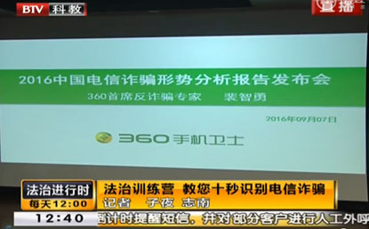 中國經(jīng)濟(jì)網(wǎng)北京9月12訊 生活中,當(dāng)你接到詐騙電話的時(shí)候,你要多久能發(fā)現(xiàn)這個(gè)騙局呢,10秒?20秒?還是根本識(shí)別不出來?9月10日,北京衛(wèi)視《法治進(jìn)行時(shí)》欄目在節(jié)目一開始便拋出了這樣一個(gè)問題。面對電信詐騙分子日益多變的手法,如何頭腦清晰地最快識(shí)別出騙局?這一期的《法治進(jìn)行時(shí)》和360手機(jī)衛(wèi)士專家一起給大家提供了很多實(shí)用的建議。