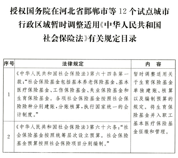 為進一步增強生育保險保障功能,提高社會保險基金共濟能力,推進生育保險和基本醫(yī)療保險合并實施改革,第十二屆全國人民代表大會常務(wù)委員會第二十五次會議決定:授權(quán)國務(wù)院在河北省邯鄲市、山西省晉中市、遼寧省沈陽市、江蘇省泰州市、安徽省合肥市、山東省威海市、河南省鄭州市、湖南省岳陽市、廣東省珠海市、重慶市、四川省內(nèi)江市、云南省昆明市行政區(qū)域暫時調(diào)整適用《中華人民共和國社會保險法》第六十四條、第六十六條關(guān)于生育保險基金單獨建賬、核算以及編制預(yù)算的規(guī)定(目錄附后),將生育保險基金并入職工基本醫(yī)療保險基金征繳和管理。試點方案由國務(wù)院作出安排,并報全國人民代表大會常務(wù)委員會備案。本決定實施期限為二年。