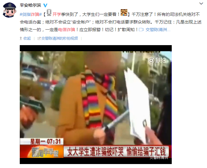 近日,一則新聞視頻在社交網(wǎng)絡(luò)上廣為流傳,一名女大學(xué)生聽信了冒充刑警的詐騙犯,前往銀行匯款,幸好被銀行工作人員及時(shí)發(fā)現(xiàn)并制止。視頻中,直到女孩的家長和真正的警察出現(xiàn),女孩仍然對騙子的話深信不疑,騙子忽悠功力可見一斑。
