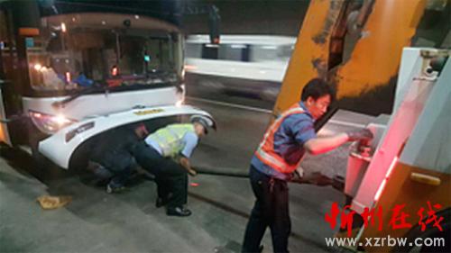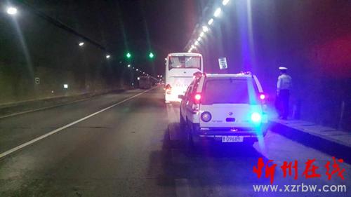 2017年5月20日14時30分許,高速二支隊九大隊巡邏民警翟躍、郭騏源在巡邏至五保高速鳳凰嶺隧道忻州方向時,發(fā)現一輛大巴車停在應急車道上,其中部分車身騎壓在行車道上,隧道旁邊站滿了人,考慮到正處國際旅游日的返程高峰時段,路面車流量較大,極易引發(fā)二次事故,造成人員傷亡,巡邏民警一方面抓緊開始做好防護設施,一方面上前了解情況,得知這輛大巴車是從五臺山去往河南方向,車上拉了40多名平均年齡五十歲左右的中老年游客,因發(fā)動機出了故障壞在路上。