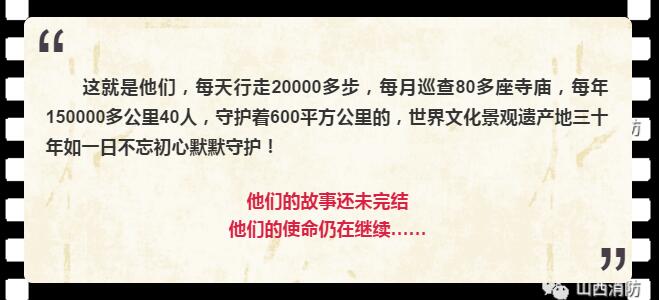 內(nèi)容簡介:該片以守護(hù)為主題,以傳承為主線,以現(xiàn)任山西忻州五臺(tái)山消防大隊(duì)工程師劉川為第一人稱視角,利用紀(jì)實(shí)跟拍的手法,通過對(duì)以劉川為代表的五臺(tái)山消防大隊(duì)官兵在消防監(jiān)督檢查、消防執(zhí)勤保衛(wèi)、日常工作生活等方面點(diǎn)點(diǎn)滴滴的真實(shí)紀(jì)錄,向觀眾展示了五臺(tái)山消防官兵在長期默默守護(hù)五臺(tái)山600平方公里的世界文化景觀遺產(chǎn)地和數(shù)十座文物古建筑消防安全中的辛勤付出和無私奉獻(xiàn),也讓觀眾了解了30多年來深深根植于每一代五臺(tái)山消防人心中的那份不忘初心、不畏艱辛、舍己奉公、代代傳承的五臺(tái)山消防精神。