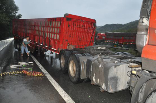 2017年08月26日19時(shí)00分許,高速二支隊(duì)九大隊(duì)民警翟躍、郭騏源接到報(bào)警稱:在五保高速8km處,有一輛紅色東風(fēng)牌重型半掛貨車因出車前未檢查車輛,駕駛存在安全隱患的車輛上路行駛,將掛車脫落,后與中央護(hù)欄發(fā)生碰撞,造成車輛及路產(chǎn)不同程度損壞的道路交通事故。大隊(duì)民警第一時(shí)間趕赴現(xiàn)場(chǎng),只有超車道可以通行,在做好安全防護(hù)的情況下,及時(shí)詢問(wèn)當(dāng)事人是否受傷,是否需要撥打“120”急救,并了解了當(dāng)時(shí)的事發(fā)情況。當(dāng)事人稱:“自己一個(gè)人開(kāi)車去陜西拉煤,走的時(shí)候著急,沒(méi)檢查車輛,在行駛過(guò)程中,就感覺(jué)車輛掛車在擺動(dòng),因?yàn)槭怯晏?,也沒(méi)在意,行駛到8km處時(shí),踩剎車過(guò)急,加之路面濕滑,掛車突然脫落與中央護(hù)欄發(fā)生碰撞,所幸人沒(méi)有受傷?!敝?,民警對(duì)現(xiàn)場(chǎng)進(jìn)行勘查,并調(diào)取監(jiān)控視頻,發(fā)現(xiàn)車輛在剎車時(shí),車速較快,駕駛員駕駛存在安全隱患的車輛是造成事故發(fā)生的原因。