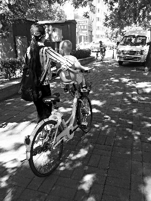 日前,記者在北京街頭遇到了一位母親,推著一輛ofo共享單車(chē),車(chē)把上裝了一個(gè)塑料兒童座椅,里面坐著一個(gè)看上去一歲多的孩子,家長(zhǎng)一邊走一邊和他人聊天,之后一起騎車(chē)過(guò)了馬路。