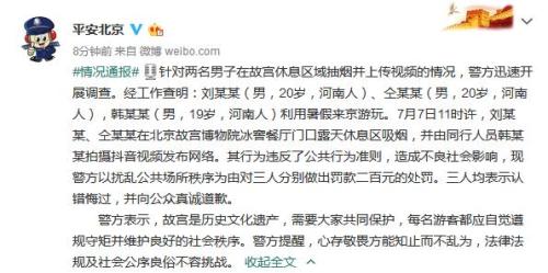 通報(bào)稱,經(jīng)工作查明:劉某某(男,20歲,河南人)、仝某某(男,20歲,河南人),韓某某(男,19歲,河南人)利用暑假來(lái)京游玩。7月7日11時(shí)許,劉某某、仝某某在北京故宮博物院冰窖餐廳門口露天休息區(qū)吸煙,并由同行人員韓某某拍攝抖音視頻發(fā)布網(wǎng)絡(luò)。其行為違反了公共行為準(zhǔn)則,造成不良社會(huì)影響,現(xiàn)警方以擾亂公共場(chǎng)所秩序?yàn)橛蓪?duì)三人分別做出罰款二百元的處罰。三人均表示認(rèn)錯(cuò)悔過(guò),并向公眾真誠(chéng)道歉。