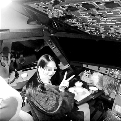 女子擺出“剪刀手”動作在駕駛艙拍照