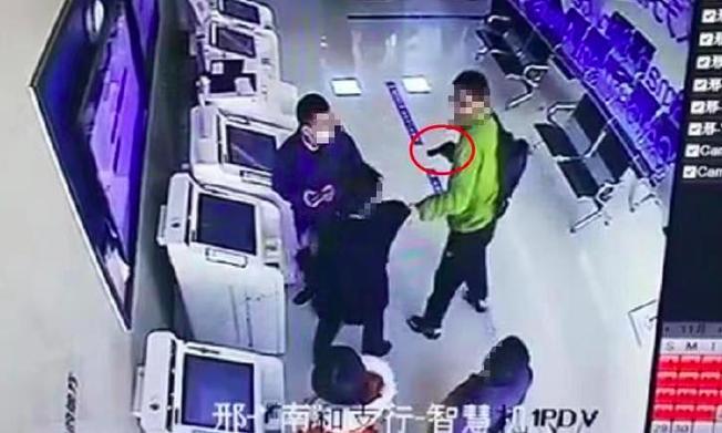 一開始,銀行工作人員正在幫助客戶操作自助系統(tǒng),一名身穿綠衣服男子右手持“槍”威脅,左手拉扯工作人員。全程20多秒,女工作人員、客戶、搶劫者仿佛商量好的一般淡定自若,氣氛非常尷尬。見沒人搭理,男子站了一會(huì)兒便自行離開。