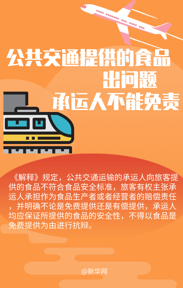 公共交通提供的食品出問題,承運人不能免責(zé) 火車飛機上提供的食品出問題,誰擔(dān)責(zé)? 《解釋》規(guī)定,公共交通運輸?shù)某羞\人向旅客提供的食品不符合食品安全標(biāo)準(zhǔn),旅客有權(quán)主張承運人承擔(dān)作為食品生產(chǎn)者或者經(jīng)營者的賠償責(zé)任,并明確不論是免費提供還是有償提供,承運人均應(yīng)保證所提供的食品的安全性,不得以食品是免費提供為由進行抗辯。