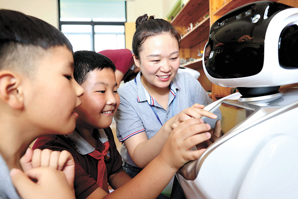為緩解未成年人假期“看護(hù)難”問題,安徽省合肥市瑤海區(qū)試點(diǎn)免費(fèi)提供音體美興趣培養(yǎng)、公益看護(hù)、讀書賞析、作業(yè)輔導(dǎo)、科技創(chuàng)新等為主要內(nèi)容的“五彩假日”托管和教育服務(wù)。圖為孩子們在和機(jī)器人做互動(dòng)游戲。 新華社發(fā)(解琛 攝)